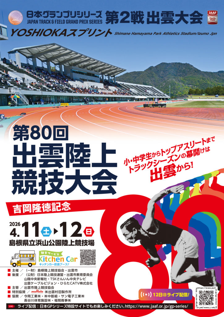 2026年度は,「日本グランプリシリーズ第2戦出雲大会 吉岡隆徳記念第80回出雲陸上競技大会」を4月11日(土)12日(日)に開催します。開催要項は、2月中旬に公表します。たくさんの選手の参加と観客の皆さんのご来場をお待ちしています。
